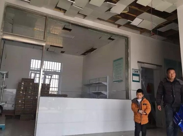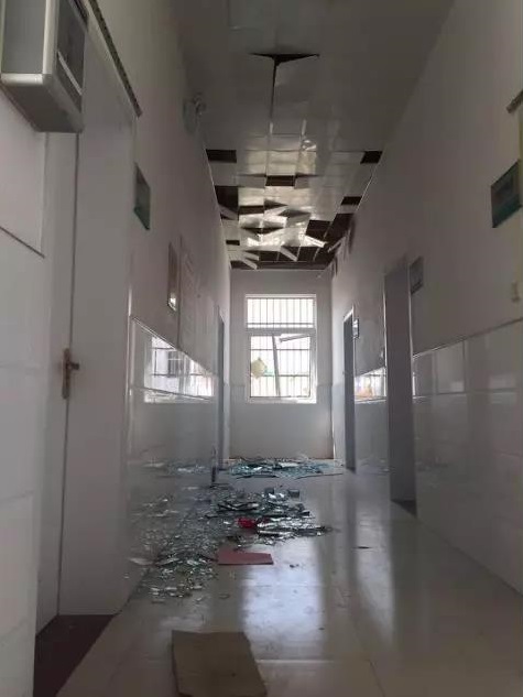 记者看到,震坏的大门已被拆卸,部分天花板也已脱落,诊室的玻璃被震碎,窗户临时用木板和塑料膜挡着,楼道内到处是玻璃渣。